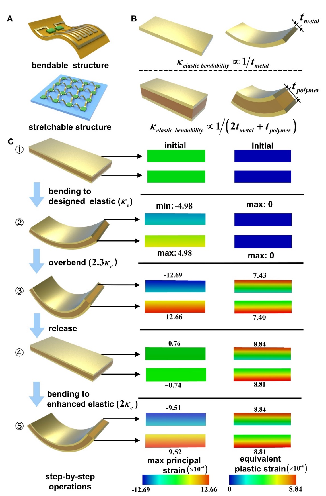 图 1 过弯曲策略操作过程。(A)可弯曲和可拉伸结构的示例。(B)不同结构的弹性可弯曲性与厚度之间的关系。(C)过弯曲策略的操作流程。左侧列展示了每个操作步骤:①-② 施加弯曲达到设计弹性可弯曲性,②-③过量弯曲超出设计弹性可弯曲性,③-④ 卸载回到原位,④-⑤ 第二次弯曲至增强的弹性可弯曲性。中间和右侧列分别展示了对应每个步骤的金属层最大主应变和等效塑性应变的有限元分析云图