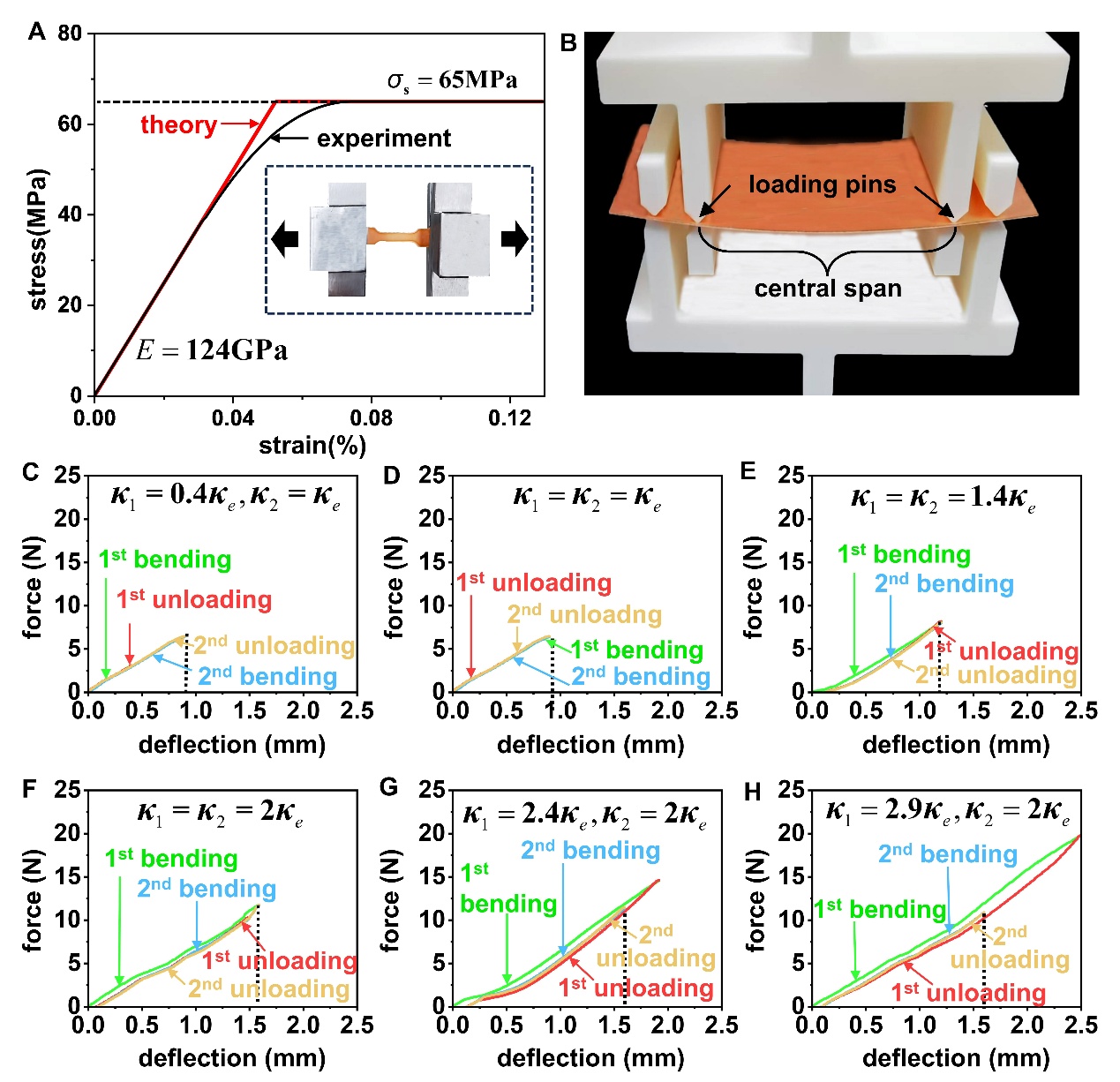 图 3实验验证。(A)狗骨形铜板的拉伸应力-应变曲线。(B)四点弯曲实验。(C-H)不同过弯曲值下的力-变形曲线,共分为四个步骤:第一次弯曲、第一次反向卸载、第二次弯曲和第二次反向卸载