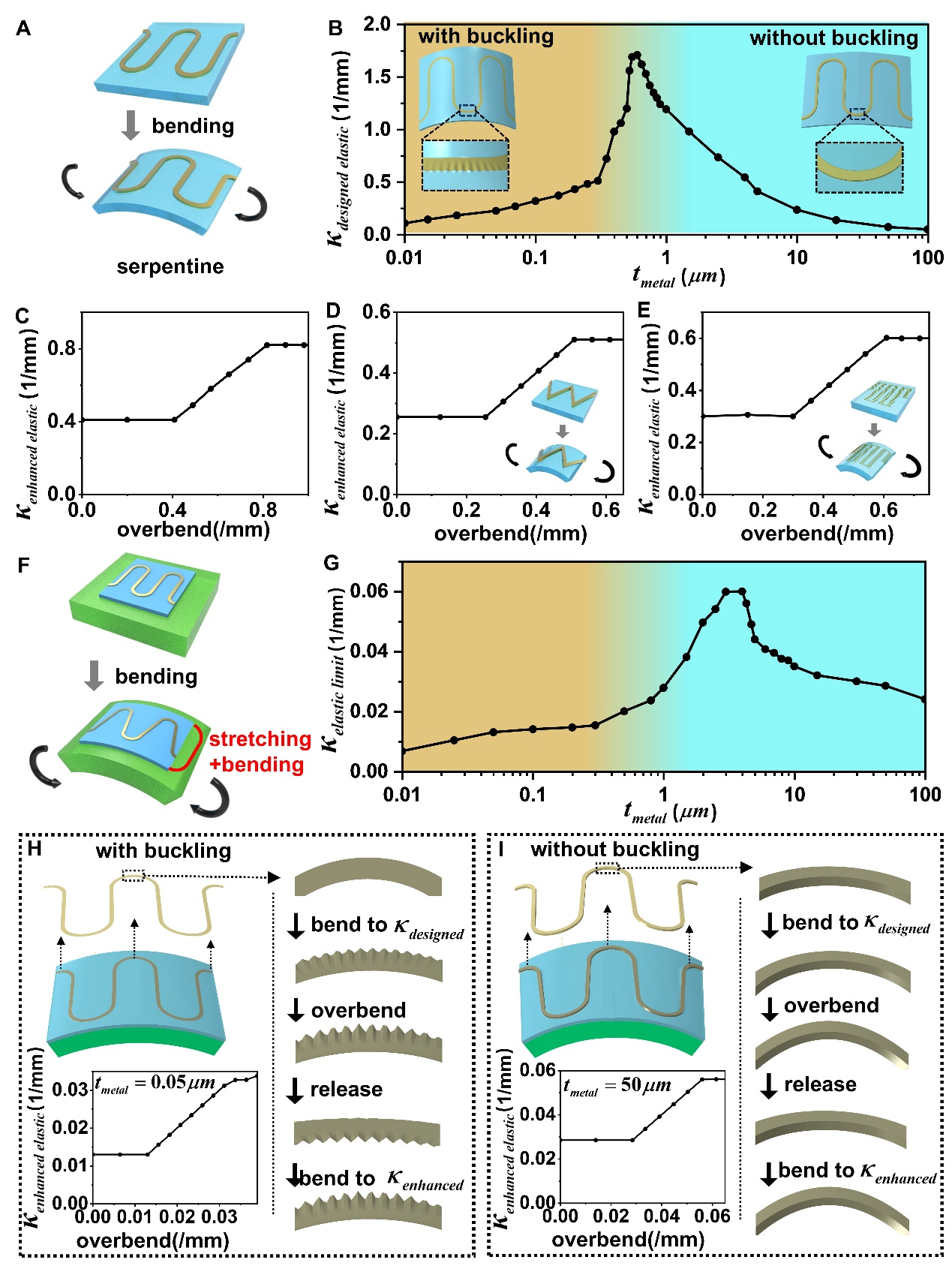 图 5 针对几何互联的过弯曲策略效果。(A)粘附在软基底上蛇形互连的弯曲。(B)具有不同厚度的蛇形互连的设计弹性可弯曲性。(C - E)粘附在软基底上的蛇形/之字形/分形互连的增强弹性可弯曲性随过弯曲值的变化。(F)蛇形互连件的拉伸-弯曲耦合变形。(G)在拉伸-弯曲耦合变形中具有不同厚度的蛇形互连的设计弹性可弯曲性。(H、I)不同的变形模式下的增强弹性可弯曲性