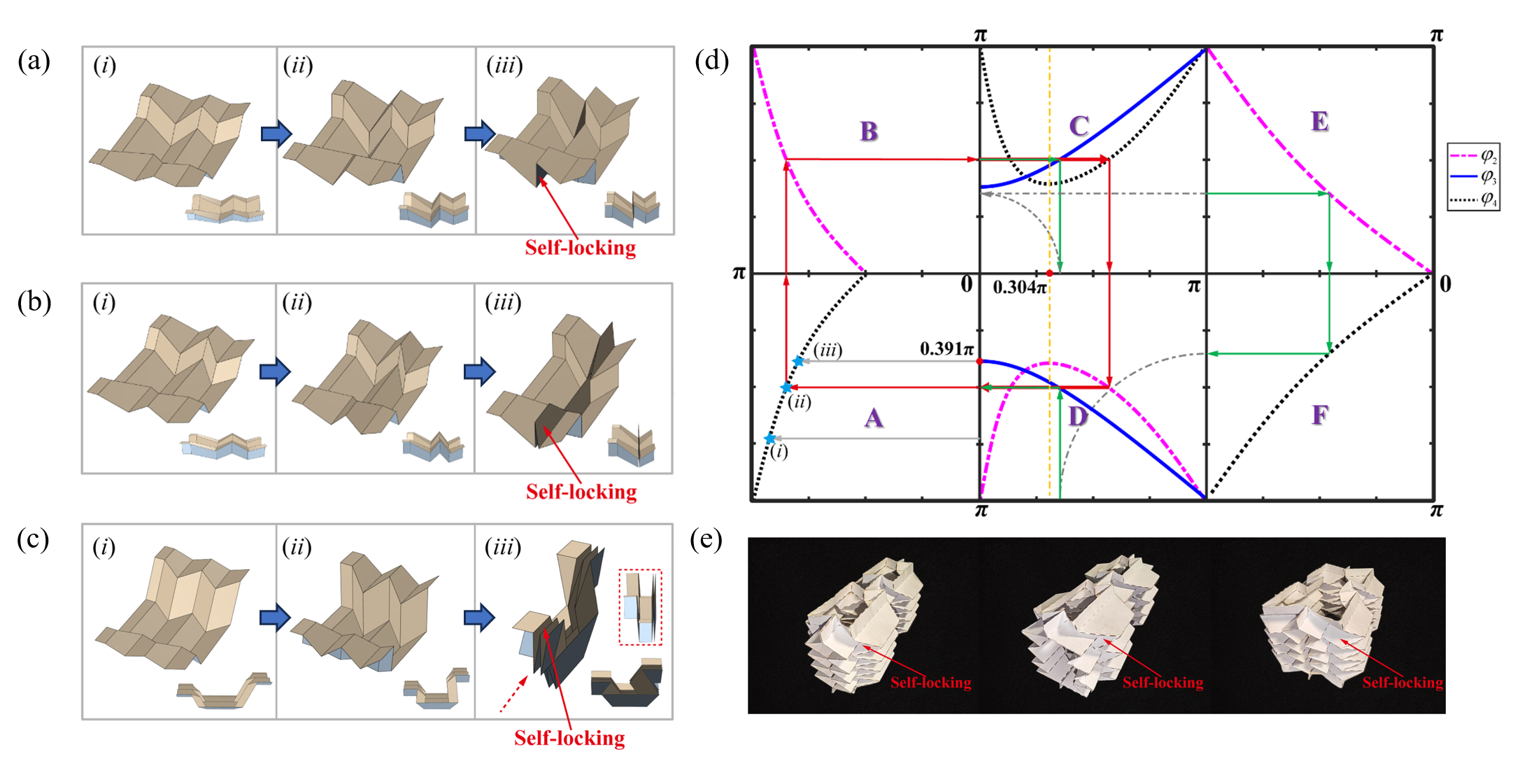 图1 结构折叠过程及运动特性验证:(a)单侧自锁折纸结构折叠过程;(b)双侧自锁折纸结构折叠过程;(c)多处自锁折纸结构折叠过程;(d)折纸结构运动传递分析图;(e)折纸超材料组装体实物及其自锁状态