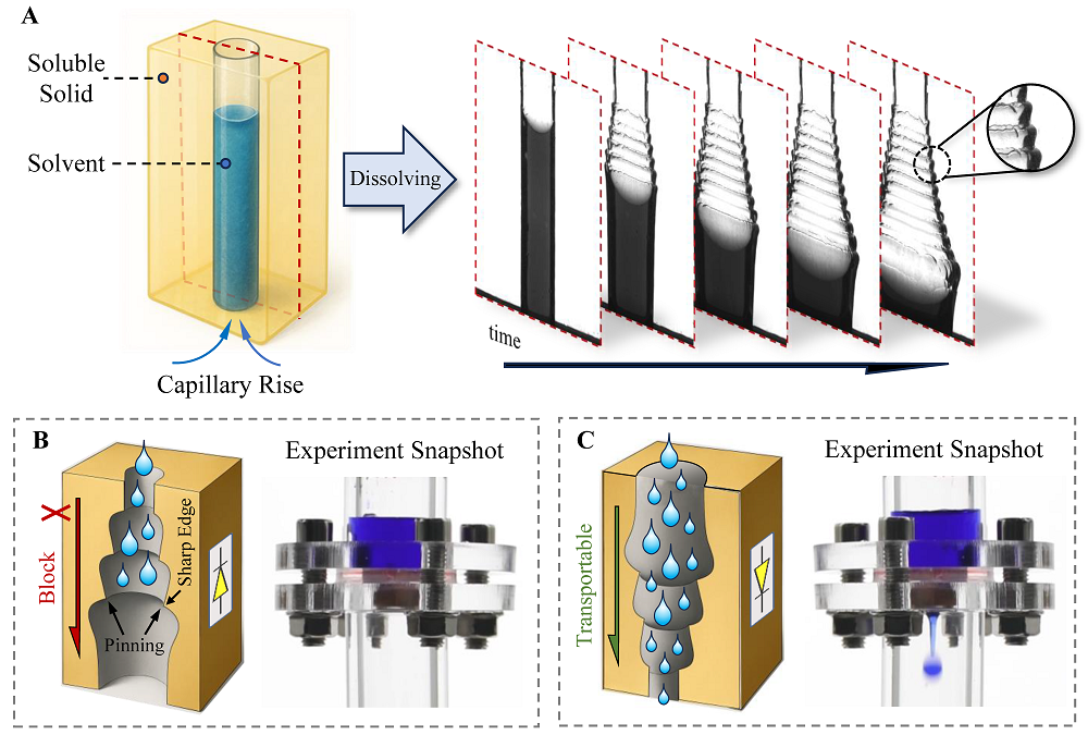 在能源、材料、微流控等关键应用领域,如何通过设计特定结构实现液体的单向输运,一直以来都是备受关注的前沿研究方向。与只允许电流单向通过的电子二极管类似,促进液体单向流动而抑制反向回流的结构被称为液体二极管。然而,由于受到空间限制,在封闭管道内设计并制备液体二极管结构是极具挑战性的。近日,Q彩网超常环境非线性力学全国重点实验室袁泉子研究团队提出了一种基于溶解现象的新策略,成功设计并制备了液体二极毛细管,实现了封闭管道内液体的定向输运。该研究不仅针对溶解导致的接触线失稳现象提出了新的理论模型,而且利用制备得到的液体二极管实现了高效的油水分离,能够为实际工业领域中大规模的油污处理提供理论指导。该工作以“Liquid-Diode Microtubes Sculpted by Dissolution”为题发表在《ACS Applied Materials & Interfaces》期刊上。