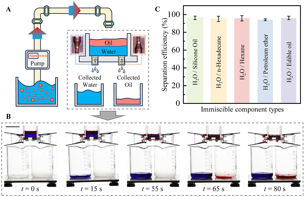 图2. 基于液体二极管特性设计的油水分离实验。(A) 油水分离实验装置,两个方向相反的液体二极管被安装在容器底部;(B) 油水分离过程实验拍摄;(C) 液体二极管实现的多种油水混合物的分离效率