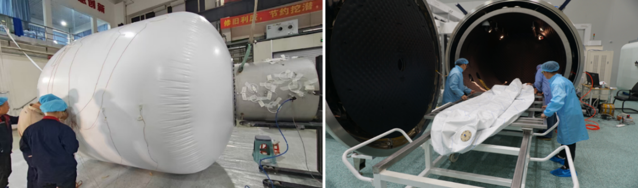图3科研团队对充气舱开展试验(左图:一阶模态试验,右图:真空环境充气测试)