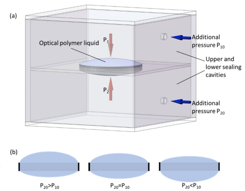 图1 流体成形与控制原理示意图。a图展示了光学透镜的流体成形与控制装置,包含模具和容器。该容器为密闭式储罐,流体成形模具固定于容器中心,内部形成环形环面并浸入密度匹配液中。该匹配液的密度与光学聚合物液完全一致。光学聚合物液与模具共同将容器分隔为上下两个密封腔室。b图说明通过向上下密封腔室施加不同附加压力,可调节上下密度匹配液在成形液中的压力差,从而实现对成形液形状的精准控制。