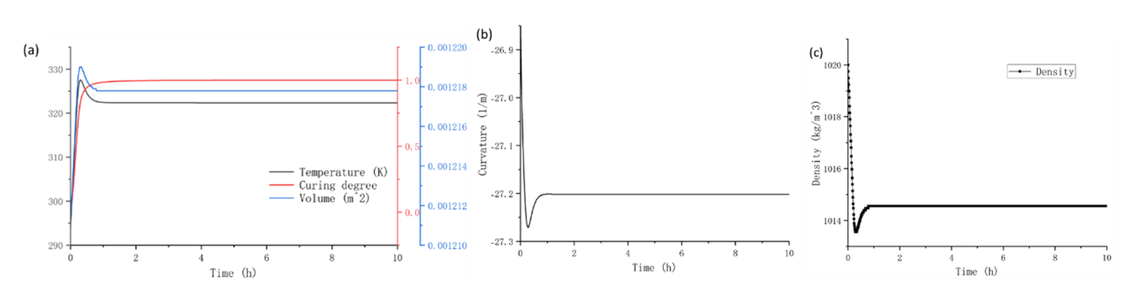 图2 50℃恒温加热高分子材料温度、固化度、体积、表面曲率、平均密度随时间的变化:a为高分子材料的平均温度、固化度、体积随时间的变化过程,b为高分子材料表面曲率随时间的变化,c为高分子材料平均密度随时间的变化