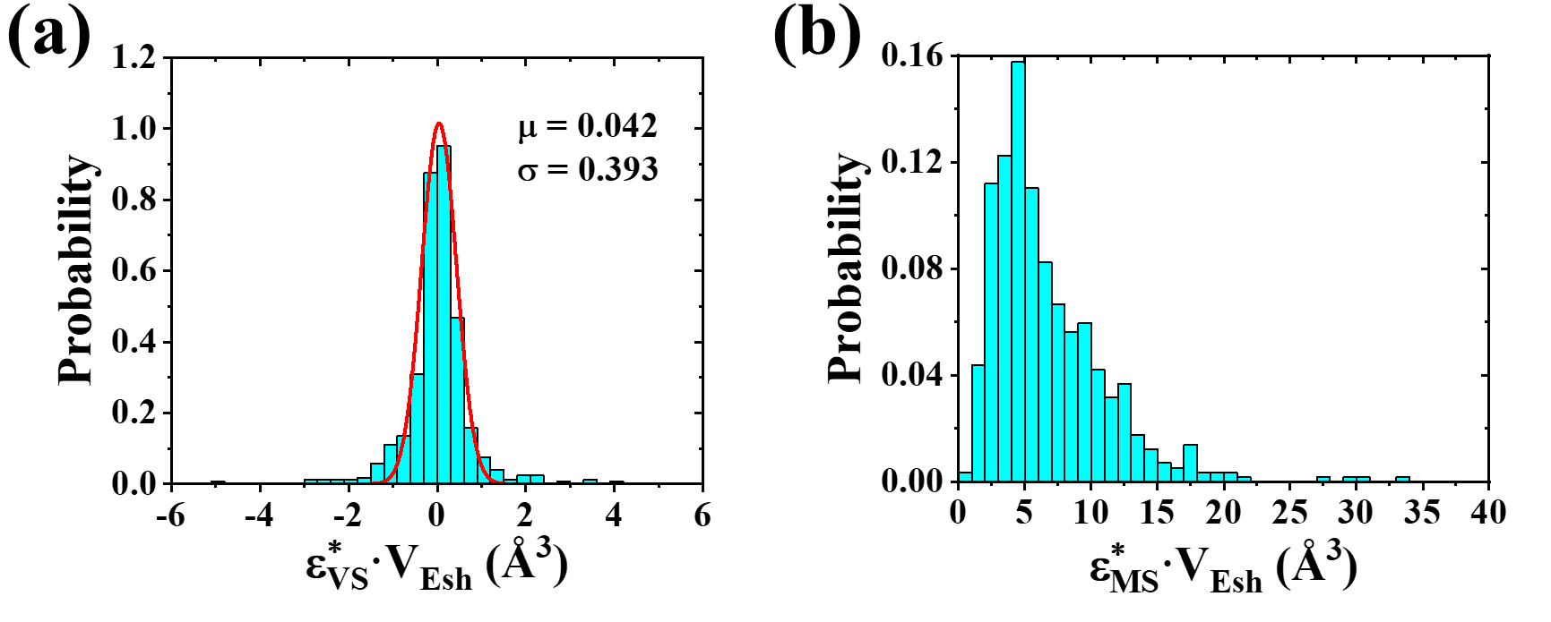 研究团队以原子模拟的Cu50Zr50非晶合金为无序固体模型体系,通过开展无热准静态剪切获得了一系列塑性事件。为了从塑性事件中识别出独立的“剪切转变”,研究团队提出了几何和力学联合准则,从而有效消除了局部涨落的影响,同时显著提升统计分析的可靠性。通过Eshelby夹杂理论对“剪切转变”应变场的空间关联分析,发现“剪切转变”的有效半径、本征应变和剪胀因子具有较宽的概率分布,存在明显的非均匀性和各向异性。在统计学意义上,“剪切转变”的几何构型近似为球体,其平均半径约为原子直径的1.5倍。除宏观加载方向外,“剪切转变”其它方向的本征应变均服从高斯分布。研究还发现,“剪切转变”的本征剪切变形远小于传统认知;体积变形可表现为膨胀或压缩两种模式,且前者略占优势。上述得到的“剪切转变”基本特征信息,为建立联系宏微观的无序固体介尺度本构提供了关键依据。