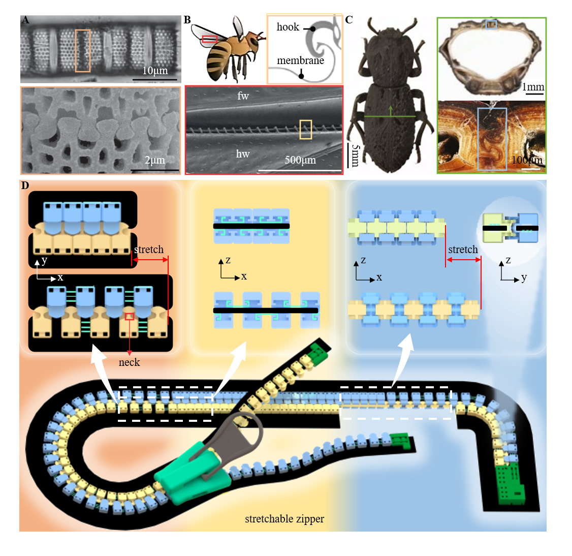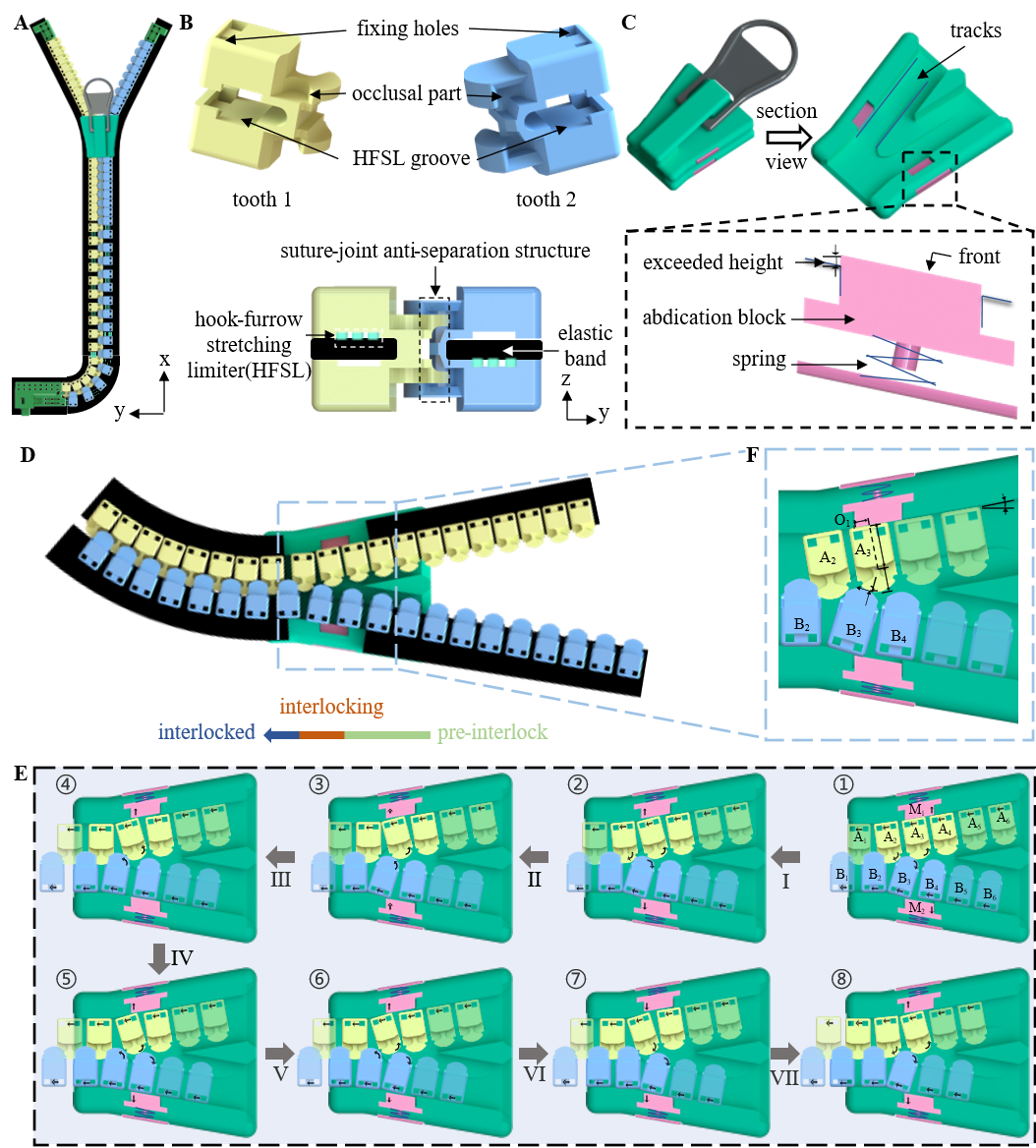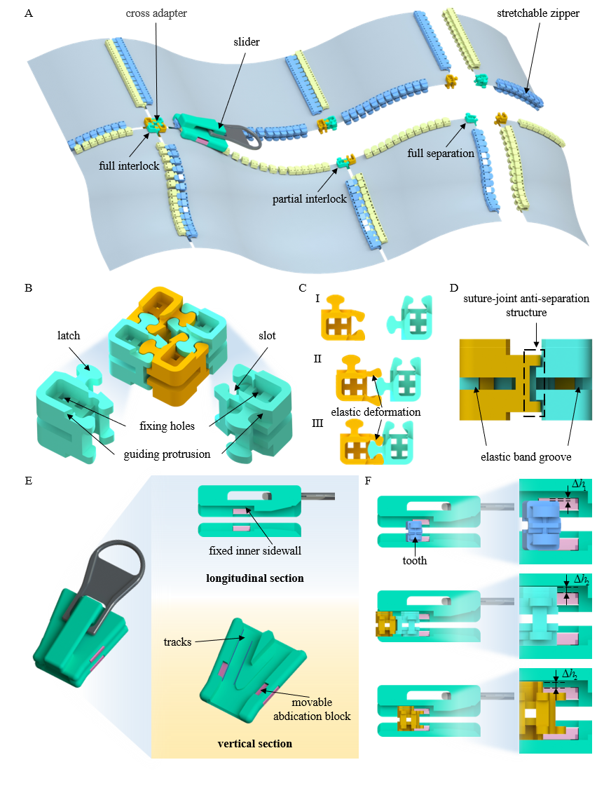 近来,力学研究所苏业旺研究员团队提出了可拉伸拉链力学结构设计,消除了拉链在实现拉伸过程中面临的传统链牙沿长度方向排列的紧密性要求与可拉伸拉链的拉伸性需求之间的矛盾,解决了拉链交叉布置时重叠区域抗干扰能力不足和无法闭合的难题。该研究成果分别以“Stretchable zipper”和“Crossed stretchable zipper”为题近期发表于新兴国际学术期刊《Soft Science》。