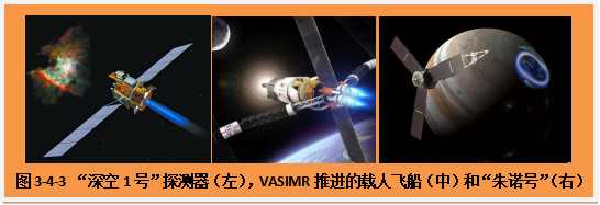 现在,咱们就从“电火箭”讲起吧!从名字上看,小朋友就可以猜到电火箭是依靠电能加速工作介质形成高速射流而产生推力的火箭发动机,不错哟!当然,这里面有电热式、静电式和电磁式等不同工作原理,它们分别是利用电能生成的热量、电场或电磁场来加热工质。其中的细节,咱们就不在这里具体说明了。但要知道的是,它的电能一般是由太阳能、核能或化学能转换而来,工质常用氢、氮、氩、汞或碱金属(铯、铷、锂等)的蒸气。电火箭发动机比冲高、寿命长(可起动上万次,累计工作上万小时),但推力小,不可能从地面发射任何有效载荷,但适用于航天器的姿态控制、位置保持和星际航行等。特别是,现在许多航天器都安装有太阳能帆板,可以把太阳能转换成电能,然后再去驱动电火箭,人们常常把这类火箭叫做“太阳能电火箭”。电火箭目前已经应用在在一些太空探测器上,如美国的“深空1号”、“朱诺号”以及欧洲的“智能1号”等。正在研究的一种先进的电磁火箭发动机叫VASIMR等离子火箭,要将工质加热到摄氏100万度,可望在39天内把载人飞船送到火星。