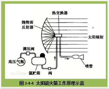 你们马上就会想到:怎么收集太阳光啊?怎么直接利用所收集到的太阳能呢?当然它不是用太阳能电池帆板了,而是用一个抛物面反射镜。这个反射镜可以把太阳光聚焦在热交换器上,于是太阳能就转换成热能,当工质液氢从热交换器通过时受热就变成高温高压气体,然后从喷管中喷射出去,这样便获得了推力。当然,火箭专家在设计时为了提高效率,就搞了一个太阳能聚集器。太阳能聚集器由两个柔性抛物面形状的镀膜聚光镜组成,一个是镀透明薄膜,作聚光透镜;另一个是镀铝膜,作聚光反射镜,它们把太阳光汇聚到热交换器上。后面的过程就和采用一个反射镜的情况是一样的了。当然,双镜结构比单镜结构复杂得多,需要非常仔细地设计。美国曾试飞过一个第三级采用这种太阳能加热的火箭。