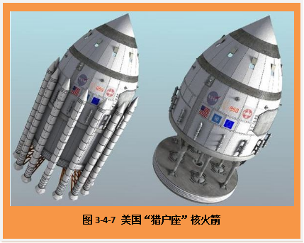 对于原子能火箭,这里还可以讲个小故事。1955年,美国国防部高级研究计划署开始了一个项目,代号为“猎户座计划”。它所研究的方案,在咱们普通人听起来好可怕啊!它的基本想法就是:在火箭的尾巴处不时地扔出一个原子弹来,利用原子弹爆炸的能量来推动火箭前进,可望使飞船速度达到光速的10%。为了避免原子弹爆炸对环境的污染,在飞船的四周布置了常规化学火箭,等飞船进入太空后再爆炸原子弹。由于原子弹是一个个依次爆炸,所以这种飞船就像个水母似一蹦一蹦地行进向前。如果采用“猎户座”运送大型载人飞船,可望在125天内到达火星,在3年内到达土星。但是,1963年,《禁止在大气层和外层空间进行核试验条约》签署了,"猎户座"计划研究不得不在1965年终止。