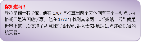 哈哈,小朋友马上要问:什么是拉格朗日点啊?其实,它的学名叫“平动点”,是十八世纪的数学家欧拉和拉格朗日推算出来的。两位数学家证明了:在两个大天体(例如,地球和月球,太阳和地球)的引力作用下,在空间中一定有5个特别的位置点;在这些点上(L1—L5),一个质量可以忽略的小物体(如人造卫星、空间站)相对于这两个大天体基本保持静止。如果把空间站设置在地-月体系的L2点,到月球的距离只有6.5万千米左右,更便于控制月球背面月球车的运行和航天员月面取样返回,在此处放置射电望远镜时可以避免来自地球的电磁波干扰,可以更方便探测近地小行星、火星及其卫星,而且可以为宇航员和航天工程师积累深空操作的经验。