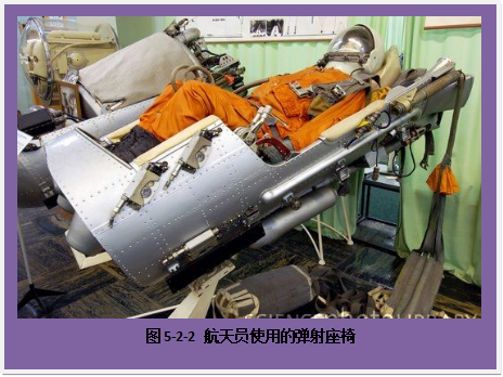 飞船上另一种常用的救生设备是弹射座椅,它的下面装有固体火箭发动机。当航天员发现飞船有危及生命安全的故障时,手动控制弹射装置:立即打开飞船的应急舱门,点燃座椅下的固体火箭,座椅以极高的速度把航天员弹出座舱,再拉开降落伞,航天员可安全回到地面。作为救生装置,逃逸塔和弹射座椅各有利弊:逃逸塔比较安全,因为航天员是在座舱内返回地面。但是如果是飞船的座舱发生故障,那么逃逸塔便无能为力了,而且它也占用了不少的运载能力。弹射座椅比较小巧,不会占用很多的有效载荷。它在飞船座舱出现危险时也能使用,但弹射过程对航天员来说容易造成伤害。有的时候,弹射座椅还是早期飞船正常返回着陆的一种方式。