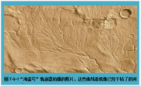 有关这方面的第一个证据来自“海盗号”轨道器拍摄的火星表面照片。其中的一张照片显示,火星上有一些弯弯曲曲的线条,最后汇聚成一条较大的粗线。这些蜿蜒曲折的线条,看起来像一些已经干枯了的河床,如果的确如此,那么在火星的历史上一定存在过丰富的液态水。