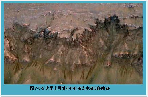 科学家还希望知道,如今火星上是否还有液态水。后来,科学家通过围绕火星运转的“火星勘测轨道器”发现,随着火星季节的变化,在陨石坑的斜坡上会出现有液态物质流动的迹象。通过深入的研究和分析,科学家认为,这些流动的物质是含有高盐分的水。在温度极低的火星表面,纯水都已结成了冰,而盐水的冰点较低,当火星上夏季温度较高时,它就会产生流动。实际上,在火星的土壤下面以及它的两极还存在大量的水冰,如果这些水冰全部融化,它就会在火星表面形成巨大的海洋。