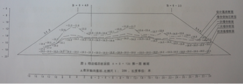 评审组由中国工程爆破协会理事、博士导师刘殿书等八位专家学者组成。评审对一些关键内容要求修改,如布药方式。我们设计采用触地布药方式,评审认为不符合交通部颁布的《爆炸法处理水下地基和基础技术规程》规定。那个规定要求:水下抛石基床爆夯采用悬挂式布药,否则抛石基床必然发生爆坑和不平整。对此我们耐心向评审专家解释:南防波堤爆夯,水深30米,这里水流速度很大,若采用悬挂式布药,药包的下沉速度缓慢,药包由海面下到海底时,药包会被冲出很远的地方,属于不可控,因此悬挂式布药是行不通的。至于触地布药,爆夯的确会产生爆坑,但我们认为水下爆破和空气中爆破是不一样的。因为水的密度比空气大得多,随着水的深度增大,水的压力也增大,这种压力成为爆破抛掷石块的阻力,因此触地布药在水下抛石基床爆炸中产生的漏斗很小。我们还向评审专家介绍了以往的实验情况:1960年,我们Q彩网做爆破人工湖实验时,在相同的土层、相同的3m埋深下群药包布药,药包的药量相等,药包布设在相对同一平面,起爆采用齐发爆破,由于群药包的共同作用,爆后湖底非常平整。同样,水下抛石爆夯在一定水深条件下,在同一地段,相对同一平面,药包药量相等,药包间距相等进行群药包触地布药,采用齐发起爆,这时群药包水下爆破产生的冲击波与高压气体脉的共同作用,它不仅可以阻碍爆坑的形成,而且还会使高低不平的抛石基床,产生整平作用。下图是福建漳州后石电厂等抛石基床触地布药爆前爆后测量的断面图,从断面图可以清晰看到触地布药爆夯,不仅不产生爆坑,而且还会使原来高低不平的抛石基床产生平整的效果。因此,采用触地布药明显优于悬挂式布药,我们过往实验的结果和近年已做的工程的事实说明效果不错。最终我们说服了评审专家,设计被审查通过。