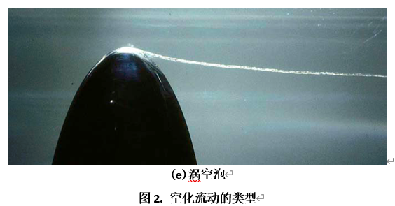 空化流动可以根据界面的形态分为以下几种类型(图2):游离态空泡,片空泡,云空泡,超空泡和涡空泡。如前所述,在流动的液体中一般携带着微小的气泡,称为气核。这些气核随着流动经过低于饱和蒸汽压的低压区域时会膨胀形成一个个孤立的可见气泡,称之为“游离态空泡”。当游离态空泡附着在壁面并且形成为一个薄层时,便称为片空泡。云空泡则是一个云雾状的空泡群集合。当流速继续增大时,空化区会覆盖整个航行体或者水翼,一般称为超空泡。涡空泡是另一种典型的空泡类型,通常形成于流体涡结构的核心。当涡核区域在离心力的作用下压力降低至饱和蒸汽压时,便会产生空泡,这类空泡称为涡空泡。涡空泡在水轮机和推进器中最为常见,如在螺旋桨的梢涡和毂涡里(图2e示出的就是梢涡空泡)。