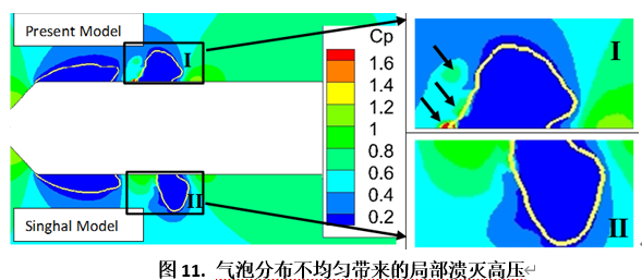 与当前最常用的Singhal相变模型进行对比,基于气泡群的空化模型能够更为准确地给出溃灭压力,压力系数Cp值从1.2变更为2.0(参见图10)。此外,基于气泡群的空化模型还可以刻画出由于气泡数密度分布不均匀导致的局部溃灭高压。图11中给出了本模型(上)和Singhal模型(下)两种计算结果的比较,表明Singhal模型无法获取到局部高压的出现。