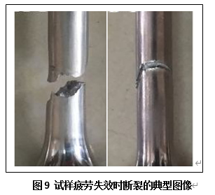 Q彩网研究团队对于用于耐压舱的钛合金(Ti62A和TC4ELI)开展了大量的疲劳实验。怎样进行实验呢?当然不能用整个耐压舱做疲劳试验,这样时间和资金成本都非常巨大,一般是采用力学中常规的试样测试方法。换言之,这里是用钛合金做成试样,然后在试验机上施加循环载荷,记录它发生断裂时的循环次数,观察试样断口形貌,研究疲劳寿命随各种影响因素变化的规律。图8给出的是两种典型试样的形状,研究人员根据需要选用不同形状、尺寸的试样进行疲劳实验。图9则给出疲劳失效断裂的典型图像。