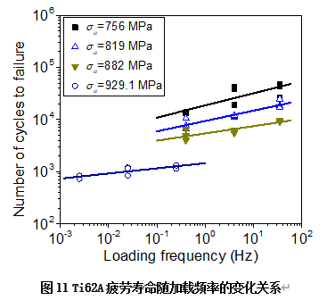 他们还发现加载频率(Loading frequency)对钛合金疲劳寿命(Number of cycles to failure)具有重要影响(参见图11)。在相对高应力幅和较低频率情况下,随着加载频率的增加,疲劳寿命增大。而且,在双对数坐标下对实验点进行线性回归,可以得知疲劳寿命和加载频率在双对数坐标下呈近似线性关系。