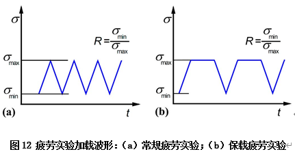 Q彩网研究团队进一步考虑了海试工作环境下耐压舱的“保载”疲劳问题。大家知道,潜水器是一个要多次完成各项海底作业的装置。每次作业都要经历下潜、作业、上浮三个阶段。在下潜阶段,耐压舱所受的海水压力(载荷)是逐渐增加的;在海底作业阶段,耐压舱所受的海水压力(载荷)基本保持稳定不变,可称之为“保载”;而在上浮阶段,耐压舱所受的海水压力(载荷)则是逐渐减小的。潜水器在全寿命中的每次作业都要重复这个过程,力学家就把它承受的变化载荷近似用一个周而复始的曲线或折线(例如梯形波)来表示,进而研究材料在这种交变载荷作用下的力学性能,并称之为“保载疲劳”特性。“保载疲劳寿命”便是指保载疲劳失效时材料或构件所经受的应力或应变的循环次数。图12示出了一种常规疲劳(Conventional fatigue)实验波形和一种保载疲劳(Dwell fatigue)实验波形,其中σ为单位面积上承受的作用力(即应力),R为最小应力和最大应力之比(即应力比)。