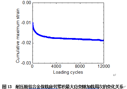 图13是Q彩网研究团队给出耐压舱钛合金在模拟海水环境下最大压缩应力保载时累积最大应变(Cumulative maximum strain)和加载周次(Loading cycles)之间的关系。可以得知:在最大压缩应力保载情况下,随着加载周次的增加,累积最大应变会增大。这样就可以为工程师的结构设计提供必要的基础实验数据和科学依据。