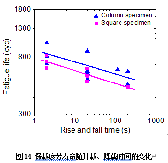 潜水器的下潜和上浮通常需要几十分钟甚至几个小时,相应地,耐压舱就要经历较长时间的升载(下潜)和卸载(上浮)作用。那么,升载和降载时间对钛合金保载疲劳寿命有什么影响呢?这也是工程师需要知道的科学数据。图14给出了实验结果,这里还分别对圆形和方形两种不同截面的试样进行了比较。在双对数坐标下,实验点的线性回归都近似是直线。它们揭示了:在相同的升、降载时间下,方形截面试样(Square specimen)的保载疲劳寿命低于圆形截面试样(Column specimen)的保载疲劳寿命。但是,关于升、降载时间的影响,两种试样的保载疲劳寿命变化趋势是一样的:随着升、降载时间的增加,保载疲劳寿命均明显减小。