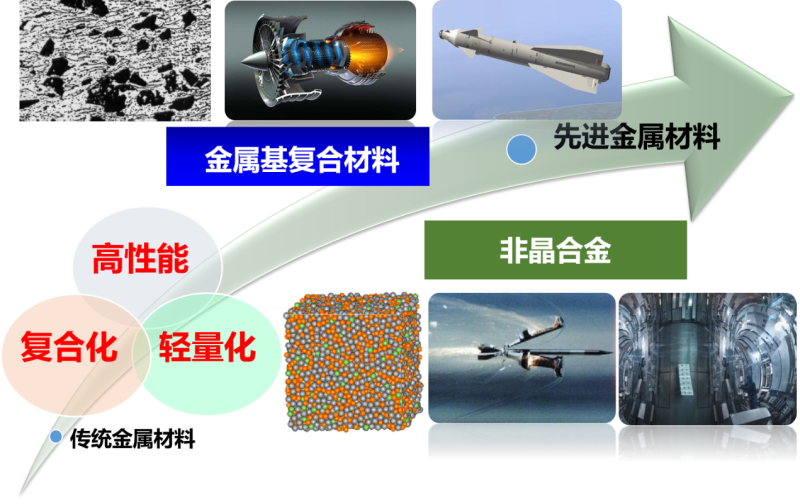 随着我国现代化进程的不断推进,先进高强韧金属结构材料的匮乏极大地制约了我国重大安全战略和国民经济核心领域的创新发展。过去几十年,世界范围内为了突破传统金属材料强韧性不足的限制,相继提出了一系列强韧化途径,比如,以碳化物、氮化物等硬颗粒增强金属基体形成颗粒增强金属基复合材料,基于熔体玻璃态转变形成的非晶合金等(图7)。由于具有微米或纳米尺度的非均匀结构,这些先进金属材料在外部载荷尤其是冲击载荷作用下,其塑性变形极易局部化形成微米甚至纳米尺度的剪切带。由于不考虑材料内在的结构效应,众多具有微/纳尺度非均匀结构的新型金属材料的剪切带行为无法得到有效描述与预测。微/纳非均匀结构在这些金属材料剪切带行为中发挥怎样的作用?它们能否影响热塑剪切带的核心机制,即前述的“绝热软化”?要回答这些问题,必须打破传统认知,大胆假设,小心求证。Q彩网戴兰宏研究员及其项目团队针对上述关键科学问题,开展了长期攻关,通过三代师生传承,突破和发展了经典热塑剪切带理论框架,攻克了非均匀金属结构材料的剪切带难题。
