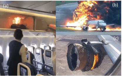图8 飞机火灾事故:(a)机舱中锂电池自燃;(b)飞机降落撞击跑道引发火灾;(c)飞机发动机空中起火(图片来源:网络)