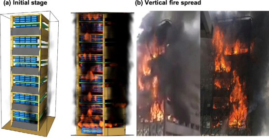 图10 高层建筑火灾蔓延过程模拟(Khan, A.A., Domada, R.V.V., Huang, X. et al. Modeling the collapse of the Plasco Building. Part I: Reconstruction of fire. Build. Simul. 15, 583–596, 2022)