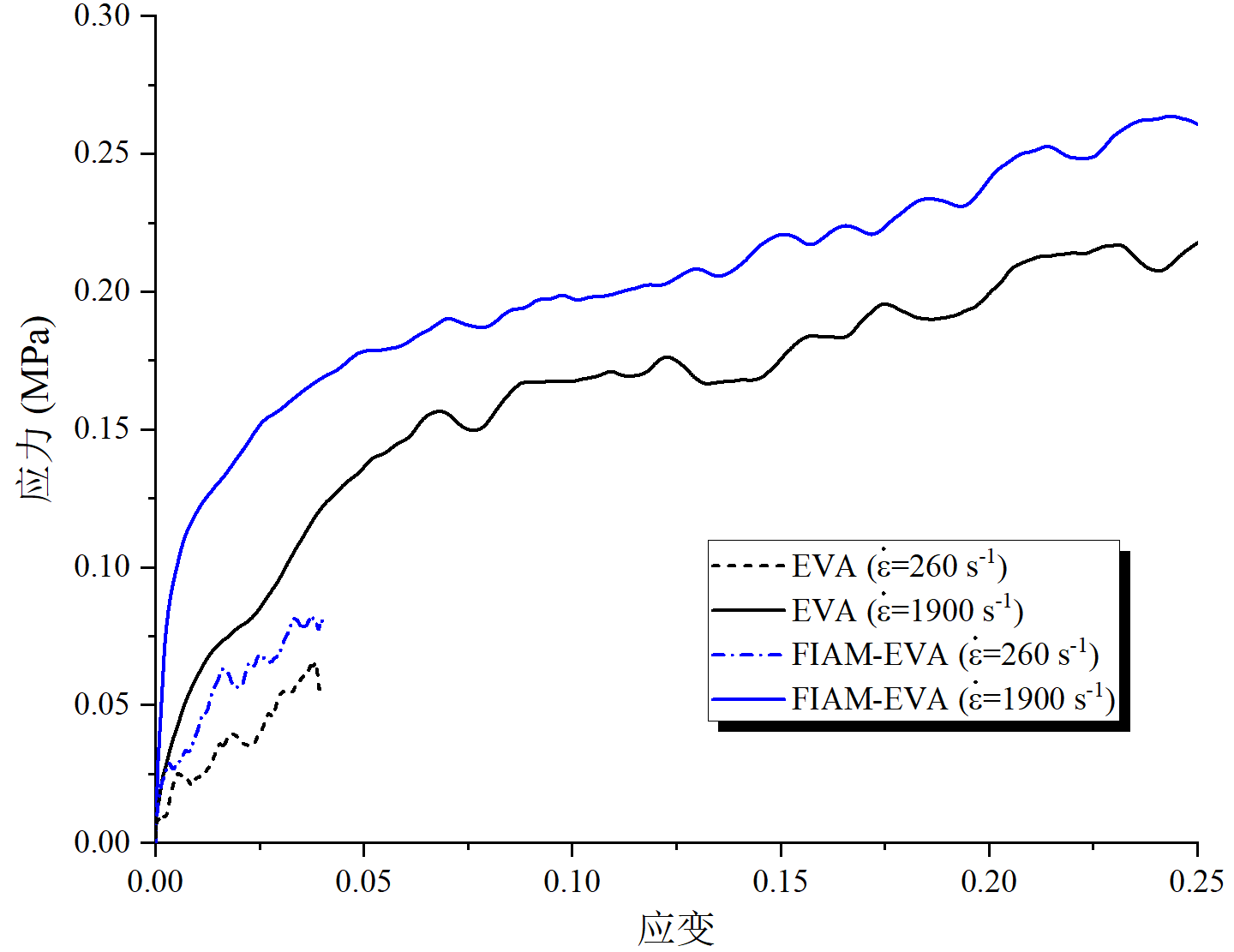 图2 不同应变率压缩作用下FIAM-EVA与EVA的应力-应变曲线(图片来源:自制)