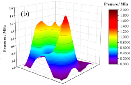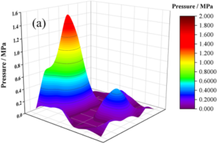 研究团队还采用多种动态测试手段(其中包括动态力学分析测试,单轴压缩测试以及霍普金森杆测试),对FIAM-EVA的动态力学性能进行测试、表征,发现了FIAM材料对基材的动态压缩强度(即动态加载作用下的极限强度)具有显著增益效果,且增益幅度随加载速率的增加而提升(参见图2)。与此同时,研究团队又通过将FIAM-EVA制成缓冲衬垫并与超高分子量聚乙烯防弹层形成新型柔性防弹衣,再使用高速发射系统对装备整体防护性能进行了测试。图3给出了FIAM-EVA(参见图3a)与EVA(参见图3b)缓冲层背部峰值压力(Pressure)的分布,结果表明FIAM-EVA缓冲衬垫背部的压力大大降低。实际测量结果还给出了,在抵挡相同的子弹冲击作用时,FIAM-EVA缓冲衬垫的背部凹陷深度仅为传统材料的49%,因此新型材料可以有效地减轻人体所受到的钝性伤害。