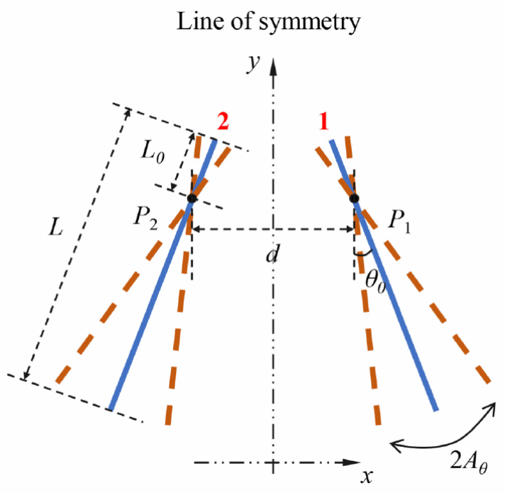 张星研究员团队的研究针对仿水母式推进(即图6所示的反相对摆翼)产生的推力型尾迹[7]。在图6中,蓝色实线表示反相对摆翼,它们关于点划线所示的对称线(Line of symmetry)对称,其他的符号意义则分别是:d为间距, L为弦长,P1和P2为支点位置,L0为前端到支点的距离,θ0为平衡张角,2Aθ为角振幅。这个高度简化的物理模型是受一些游动或飞行生物的启发而得到的:如推进的水母、并排游动的鱼、合拢-打开的昆虫双翅(参见图1)。显然,它的几何外形以及运动形式具有镜面反射对称性。先期的研究表明,在一定条件下,反相对摆翼的尾迹会出现自发的对称性破缺,进而影响其悬停稳定性和推进性能 [8][9]。但是,对于尾迹发生对称性破缺的临界条件和物理机制,人们目前尚不了解,因而该团队采用基于N-S方程的直接数值模拟(DNS)和Floquet稳定性分析相结合的方法展开了分析研究,以期揭示无来流条件下(即模型在流体中悬停时)反相对摆翼的尾迹发生对称破缺的物理机理。