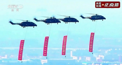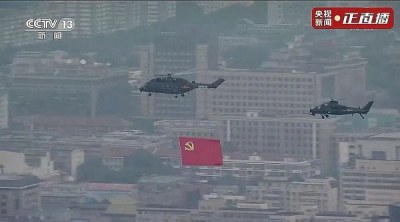 图1 直升飞机携带着庄严的党旗在空中飞行(图片取自网络)