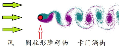 人们在日常生活中,不难见到各种旗帜在风中飘扬的场景。就如那首耳熟能详的歌曲所描述的:五星红旗迎风飘扬,胜利歌声多么响亮!为什么风一吹过旗就舞动呢?对于这个现象,人们认为是“卡门涡街”在作怪。什么是“卡门涡街”呢?它是流体力学的一个学术术语,可以采用图3所展示的流动模型来说明。一般情况下,旗面是系在旗杆上的,而旗杆的横截面多是圆形的。如果风速是均匀的,旗杆足够长,这就可以简化为一个二维流动问题,即可以在一个横切面中进行讨论(如图3所示)。这里,风作为一个均匀来流,吹向旗杆(图中的圆柱形障碍物),那么在圆柱的下游便会周期性地脱落出旋转方向相反、排列规则的双列旋涡。发现这个现象的是德国空气动力学家冯·卡门。因此被命名为“卡门涡街”。冯·卡门后来去了美国,在加州理工学院任教,曾是我国火箭之父钱学森的导师。旗面作为一种特殊的结构物,在这种气流作用下发生震荡,这是结构弹性力和空气动力相互耦合产生的动力学行为,也可以说是一种流固耦合现象。不难想象,旋涡在向下游演化时会逐渐发展变大,因此旗面尾部还会发生剧烈的抖动,如果轻薄柔软的锦丝绸材料自身刚度不足,便可能使得旗帜尾部的边缘局部受损,甚至导致整个旗帜破损。