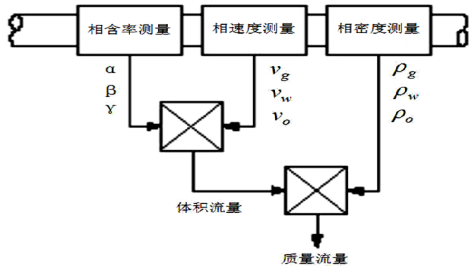 油气水混相流量计量早在1980年左右就提出了,目的在于解决海洋油气开采水下生产系统的海底单井产量计量问题,并被称之为水下生产系统三大核心技术之一。而且,陆上油田实现单井混相计量,也能简化生产工艺,节省投资。统计分析表明:与常规的分离计量相比,在海上平台使用多相流量计可节省费用50%左右,而水下多相计量装置的使用可节省费用约80%。于是,吸引了许多科研机构和油公司研发机构致力于油气水三相流量计的研发工作。油气水三相流量计量的基本原理见图6所示。