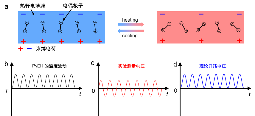 图1(a)热释电效应原理图示;(b)恒正的温度波动(temperature fluctuation);(c)输出电压的实验测量结果,(d)理论预测的开路电压(Open-circuit voltage)