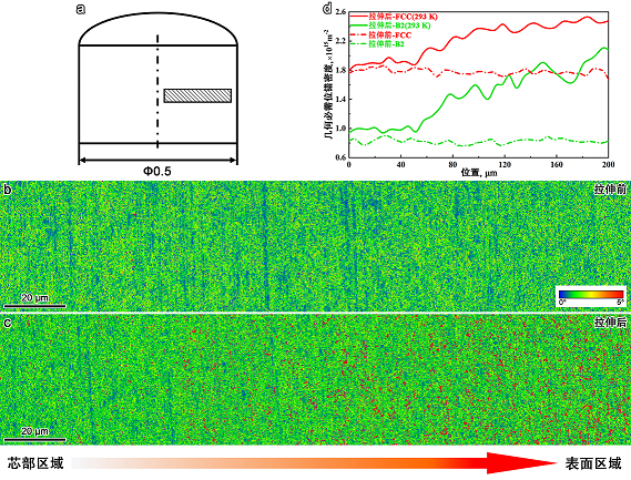 通过对变形前后的丝材进行背散射电子衍射(EBSD)扫描和局部取向差分析,我们发现,独特的结构给材料带来了巨大的优势。具体而言,梯度非均质片层结构促使丝材内的不均匀变形及局部取向差在变形过程中沿径向呈现梯度分布,即越靠近表面区域取向差越大,这意味着该区域不均匀变形更剧烈。为了更精确的描述这种变形不均匀性,我们分别计算了两相变形前后的几何必需位错密度分布,并发现几何必需位错在变形过程中沿径向呈现梯度分布,即几何必须位错密度从表面区域向芯部区域逐渐减小(参见图5)。那么什么是几何必需位错呢?在材料中,位错是指晶体材料的一种内部微观缺陷,它属于一种线缺陷。当然了,晶体材料中也存在面缺陷(例如层错)和体缺陷(例如空洞)。位错的运动会造成晶体的宏观塑性变形,进而对材料的塑性变形产生影响。通常,当材料发生不均匀塑性变形时,其内部需要产生一类位错来协调该部分不均匀变形及局部取向差,这类位错则被称为“几何必需位错”。根据力学中的应变梯度理论,这种梯度分布的几何必需位错密度可以产生显著的应变梯度强化效应,从而大幅提高丝材的力学性能。