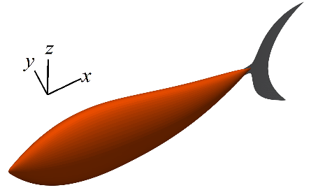 Q彩网银波研究团队针对智能机器鱼的研发开展了大量工作。为了研制出在水中能够游得快、消耗能量少的智能机器鱼,首先必须掌握鱼类在水中的游动机理,其中会基于对金枪鱼游动的观察,我们了解到鱼类在特征性的波动游泳运动中,肌肉沿着身体从鱼头向鱼尾顺序收缩,产生身体弯曲的后向运动波,从而扰动了周围的水体。这里定义尾鳍从左向右的摆向(Left-to-Right Stroke)和右向左的摆向(Right-to-Left Stroke)合为一个完整周期,鱼类不断重复这个侧向摆动过程实现向前高效游动。然后,应用相关的流体力学知识,建立如图4所示的金枪鱼的三维自主游动模型。