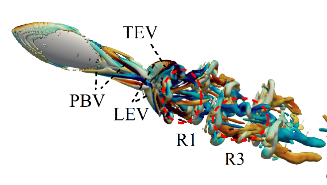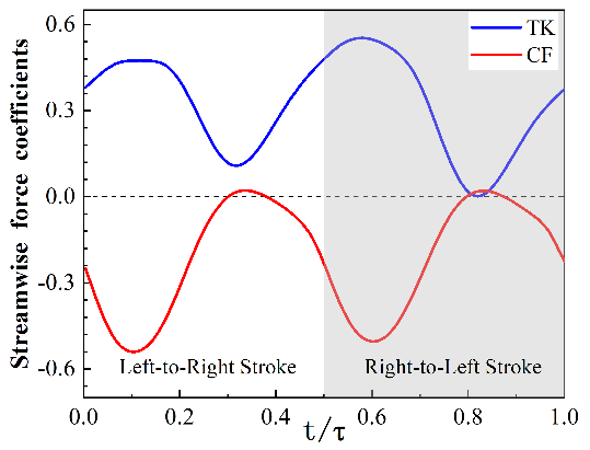 对于鱼体摆动过程中游动机理,研究团队做了细致的分析,包括不同部位的受力特征和尾迹涡图像。图5(a)则分析了在一个完整的游动周期(τ)中,身体(TK)和尾鳍(CF)沿前进方向的受力变化特征,其中横轴表示在这个周期中的不同时刻(t/τ),纵轴表示流向力系数(无量纲化后的)。我们定义受力正方向与鱼前进方向相反,由图可看出在游动过程中,身体主要受阻力,而尾鳍是推力的主要来源。此外,我们还分析了尾迹涡形成和脱落的具体过程,尾迹涡的演化情况可参见图5(b)。摆动过程中,在身体的体后会形成较强的涡,定义为“体后涡”(PBV),体后涡的脱落会与尾鳍前缘形成的“前缘涡”(LEV)发生碰撞,这个过程会有益于增强尾鳍前缘涡的强度,会有利于推力产生。随着鱼体摆动,旋涡向尾鳍的后缘发展,形成了尾鳍“后缘涡”(TEV)。进一步的摆动使得尾鳍后缘涡脱落,在尾迹中形成交错排列的反卡门涡街,涡街呈链式涡环结构,R1和R3即是其中的环状结构。根据对受力过程和尾迹涡发展过程的分析,我们得出了身体摆动方式和鱼体外形对游动性能的影响规律。在此基础上,我们便可以挑选出游得快、效率高或者满足任务需求的鱼体外形及摆动方式。