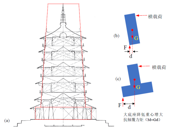 应县木塔是放在基座之上的,那么它是如何提供建筑的抗倾覆力矩的呢?这主要涉及到三个方面:(1)向上收缩的变截面。这保证了木塔的中心尽可能地在木塔的对称轴(中线)上,这样横向载荷产生的倾覆力矩在各方向相同,所需的抗倾覆力矩在各方向也相同,便可以避免因为某一侧载荷过大而导致结构的失衡;(2)应县木塔第一层直径较上面各层直径有明显的增加。对于没有大底座的建筑(参见图9b),在横向载荷下,地面支撑力F与重力G形成抗倾覆力矩较小,因为间距d很小(在力学中,它称作“力臂”),若横向载荷偏大极有可能翻到;但如果有大底座(参见图9c),一方面它降低了建筑整体的重心,另一方面使得地面支撑力作用点向外移动,这就大大增加了建筑的抗倾覆能力;(3)古建筑的屋顶通常都很重,增加了建筑物的重量G,也起到了增加抗倾覆能力。总之,应县木塔在较大重量和底座的配合下获得了足够的抗倾覆力矩。