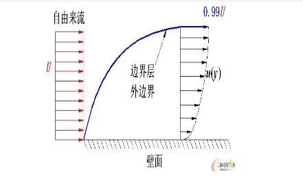 流体力学告诉我们:空气具有粘滞性。这具体表现为贴附在物体表面的一层空气相对于物体静止,随着远离物体表面,空气的速度逐渐增加到主流区数值。这层紧贴物体表面而且速度发生明显变化的区域,在力学上称为“附面层”或者“边界层”(参见图5所示)。在图5中,设定物体速度为零,因而壁面处气体速度为零。对于运动中的汽车,壁面处空气的速度和汽车运行速度相同,而边界层外缘处的空气速度为零。由于边界层内的空气受到粘滞作用力而被物体牵动,按照牛顿第三定律,边界层对物体施以反作用力,此反作用力与物体运动速度方向相反。这个反作用力阻碍汽车的运动,故称为“摩擦阻力”。流体力学研究给出:摩擦阻力的大小与物体相对于空气速度的平方以及表面积成正比。