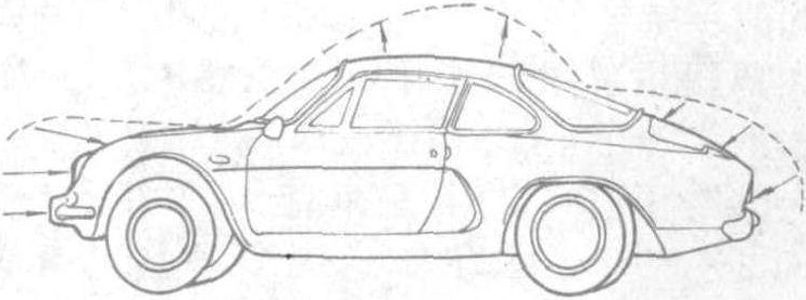流线型是表面处气流没有明显分离的物体形状。近代轿车车型都设计为流线型,它们的外形特点是前圆后尖、表面光滑,迎风横截面积要尽量小,车灯、后视镜、门把手以及车窗等装置要和车身浑然一体。流线型汽车在气流中的阻力可降低到一般车型的60%。采用流线型设计的汽车可节省大量燃油,因为汽车在行驶中大部分燃油用于克服各种阻力。现代汽车的挡风玻璃采用弯曲设计,也是流线型外形的重要构成。