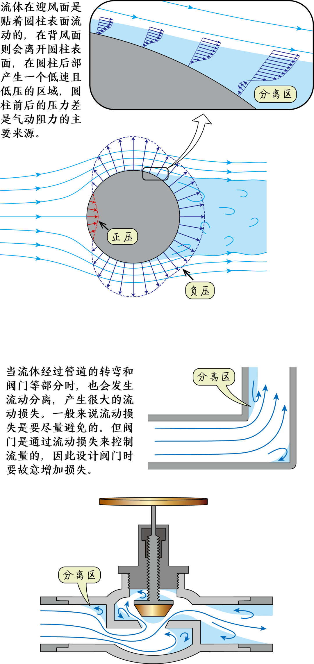 如果汽车外型设计适宜,使附面层气流能完全贴着汽车表面流向后方,流速随之降低,压强随之加大,有可能使汽车后半段所受气流向前压力抵消前半段所受气流向后压力,从而压差阻力几乎降低为零。然而,事实上,附面层气流并不会完全贴着汽车表面流向后方的,它可能与物体分离(参见图7)。边界层分离之后,它将从紧靠物体表面的地方抬起进入主流,与主流发生掺混。一般情况下,分离区的流动中还会出现各种尺度的旋涡,分离的气流速度不再降低, 压强也不再升高,从而导致压差阻力增大。流线型汽车的表面气流无明显分离,故压差阻力最小。
