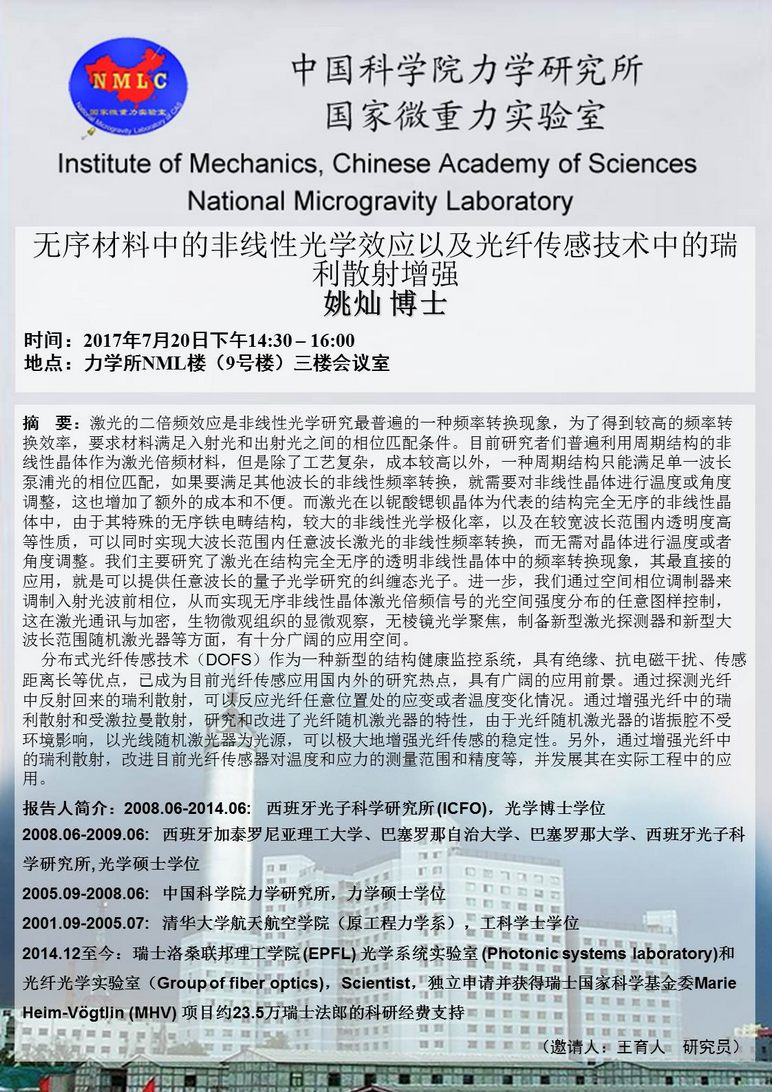 (7月20日14:30)无序材料中的非线性光学效应以及光纤传感技术中的瑞利散射增强