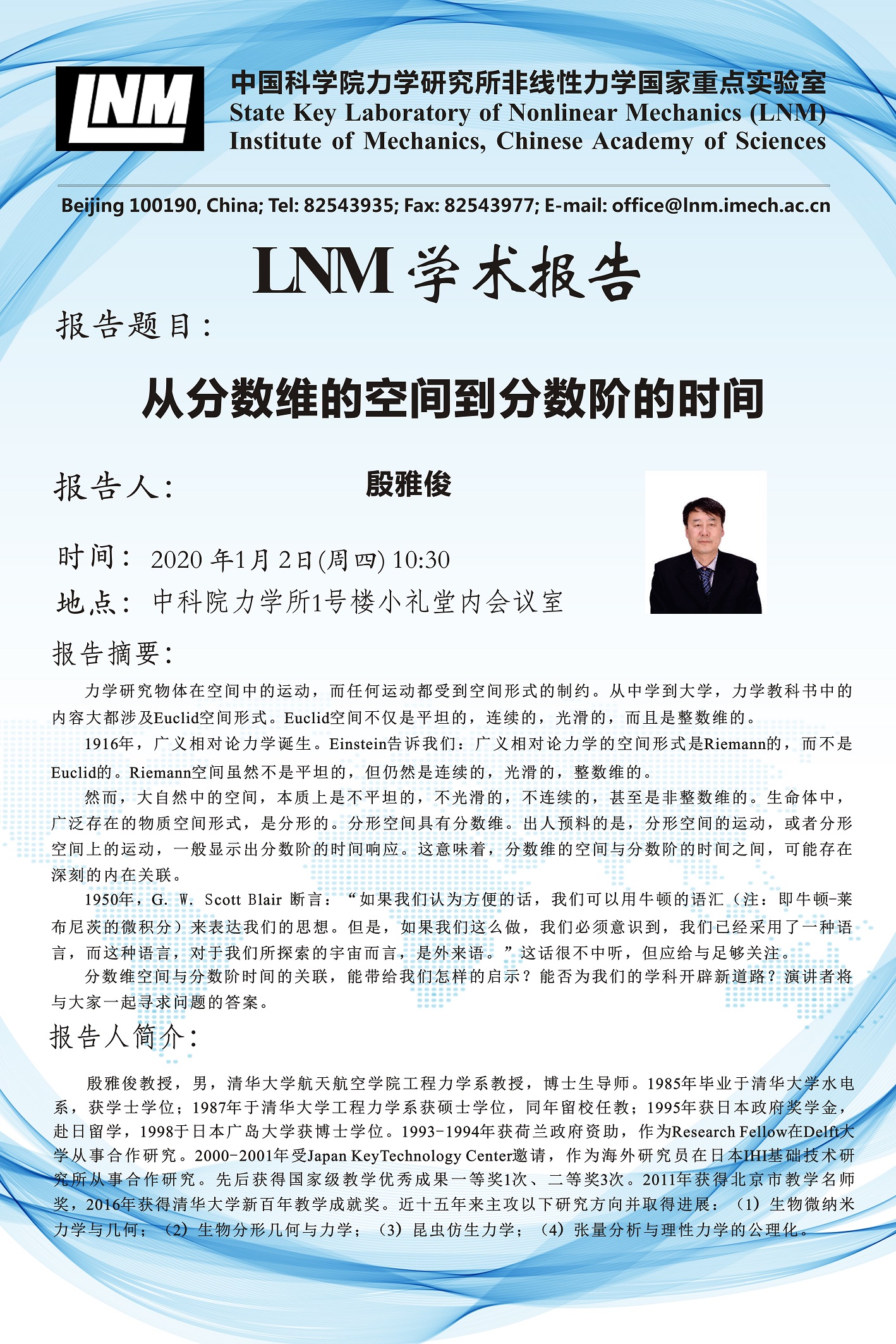 (1月2日 10:30 1号楼小礼堂内会议室)从分数维的空间到分数阶的时间