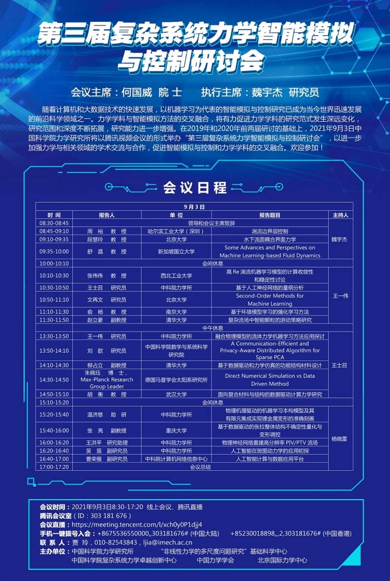 (9月3日 8:30 线上)第三届复杂系统力学智能模拟与控制研讨会