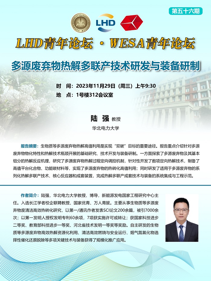 (LHD青年论坛&WESA青年论坛 11月29日9:30 一号楼312会议室)多源废弃物热解多联产技术研发与装备研制