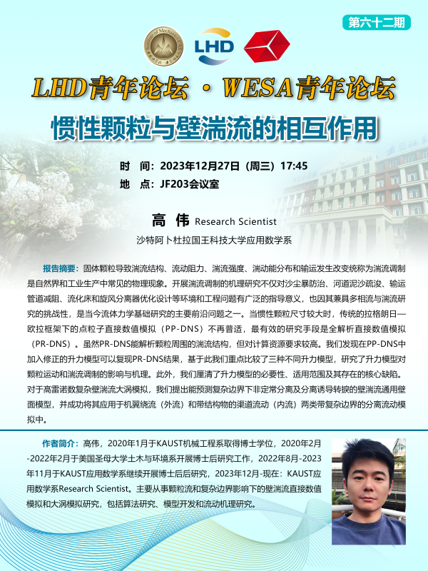 (LHD青年论坛&WESA青年论坛 12月27日17:45 JF楼203)惯性颗粒与壁湍流的相互作用