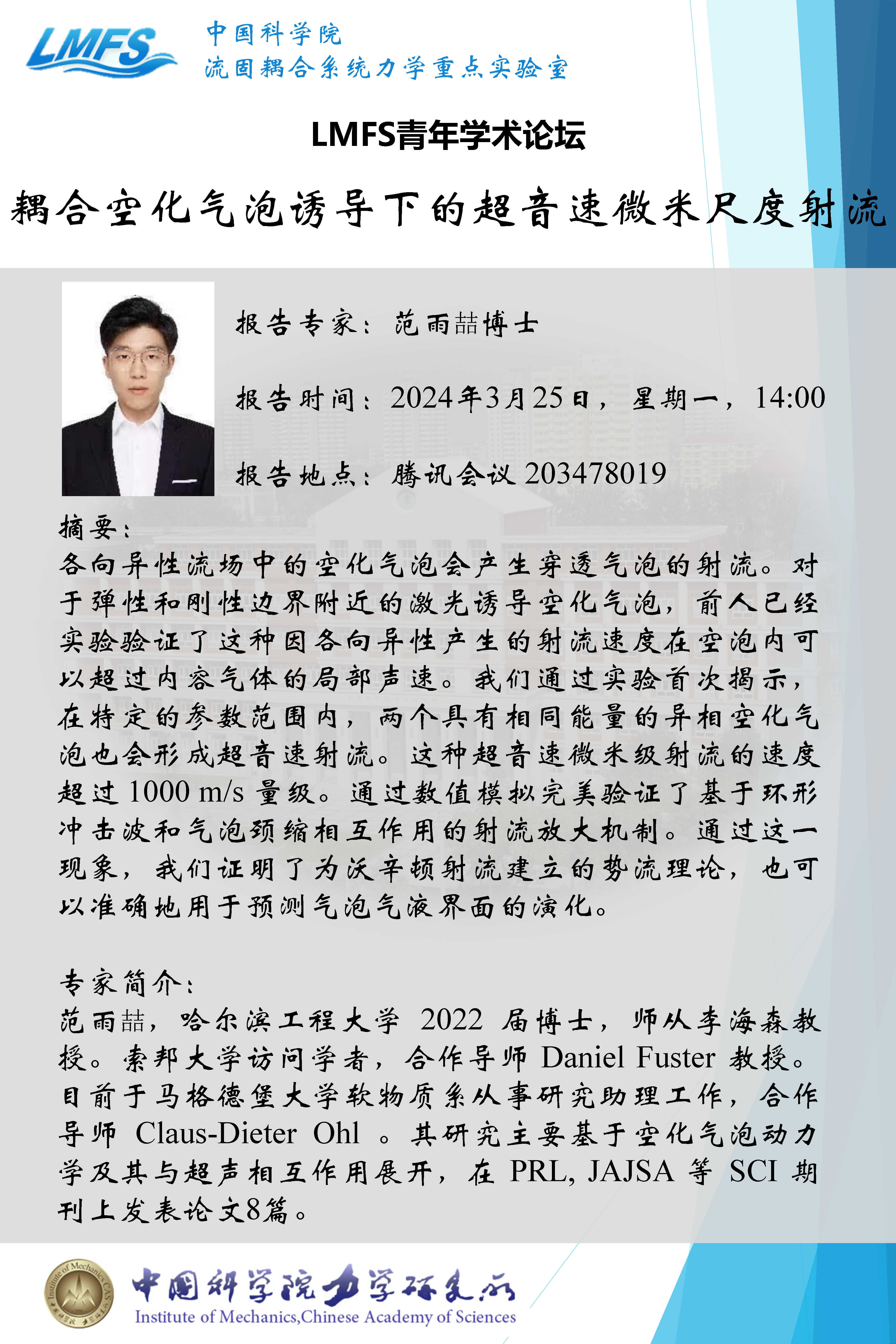 (LMFS青年学术论坛 3月25日14:00 腾讯会议 203 478 019) 耦合空化气泡诱导下的超音速微米尺度射流