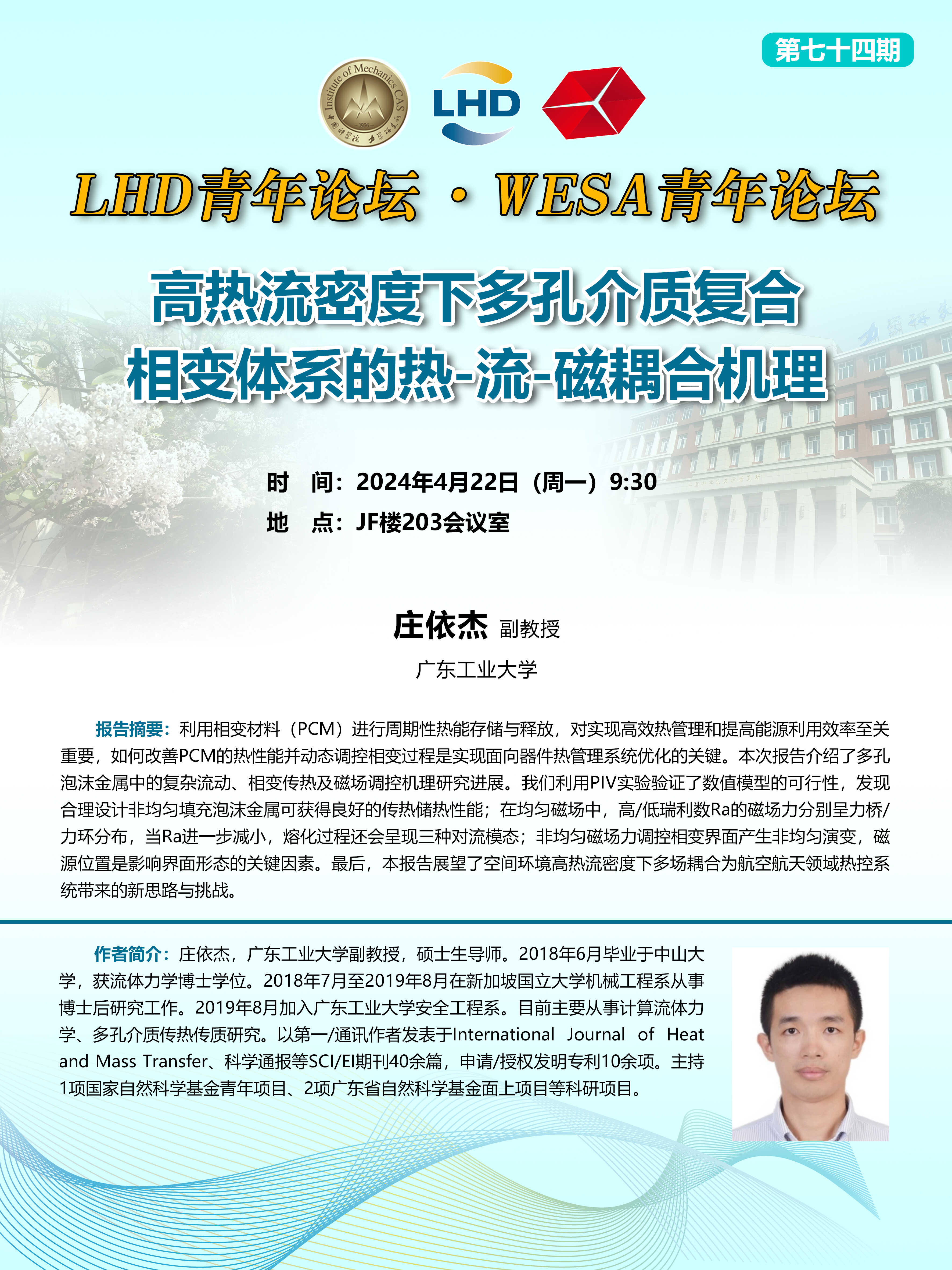 (LHD青年论坛&WESA青年论坛 4月22日 9:30 JF楼203会议室)高热流密度下多孔介质复合相变体系的热-流-磁耦合机理